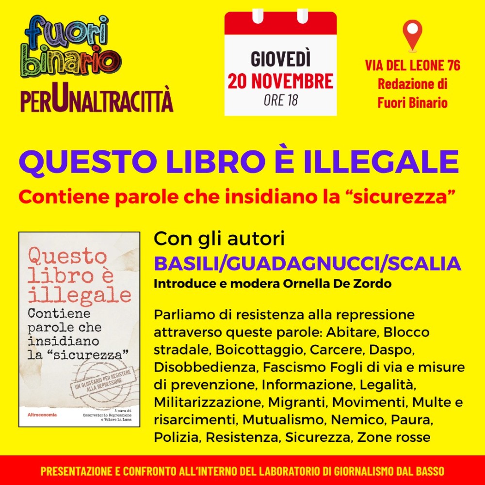 Un appuntamento dedicato alla difesa dei diritti, alla critica delle derive autoritarie e alla costruzione di strumenti concreti per reagire. Giovedì 20 novembre, alle ore 18, la redazione di Fuori Binario in via del Leone 76 a Firenze ospiterà la presentazione del volume pubblicato da Altreconomia e promosso da Osservatorio Repressione e Volere la Luna: un vero e proprio glossario per resistere alla repressione e per orientarsi dentro una società sempre più militarizzata, dove il dissenso viene spesso criminalizzato e i diritti rischiano di essere subordinati alla paura.