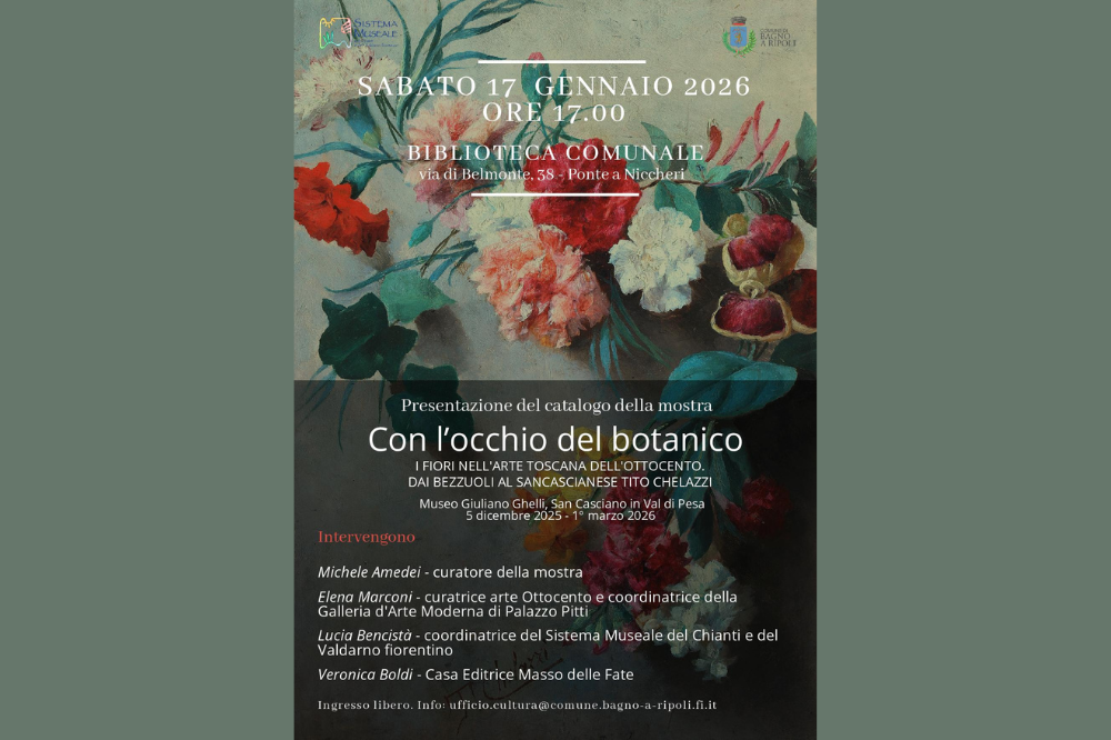 I fiori nell’arte toscana dell’ottocento, dai Bezzuoli al sancascianese Tito Chelazzi, saranno protagonisti dell’incontro pubblico in programma sabato 17 gennaio alle ore 17 in Biblioteca comunale a Bagno a Ripoli (via di Belmonte 38). Durante l’iniziativa sarà presentato il catalogo della mostra “Con l’occhio del botanico”, in corso fino al 1° marzo al Museo “Giuliano Ghelli”. Ad illustrarlo saranno il curatore dell’esposizione, Michele Amedei, accompagnato da Elena Marconi, curatrice arte dell’Ottocento e coordinatrice della Galleria d'Arte Moderna di Palazzo Pitti, dalla coordinatrice del Sistema Museale del Chianti e del Valdarno fiorentino, Lucia Bencistà, e da Veronica Boldi, referente della Casa Editrice Masso delle Fate.