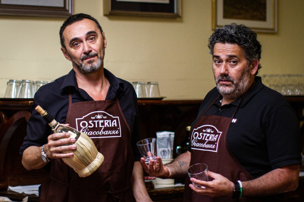 Questa non è solo un'osteria, ma un'osteria con spettacolo incluso. Un po’ come se avessero incrociato Broadway con una vendemmia in Toscana! Non ci sono il fantasma dell'opera o le divise di velo e cravatta. No, signori. Qui si parla di tavoli pieni zeppi di vino e formaggi, con Giacobazzi e l’aiuto oste Andrea Vasumi che servono cibo e battute da far ribaltare i bicchieri.