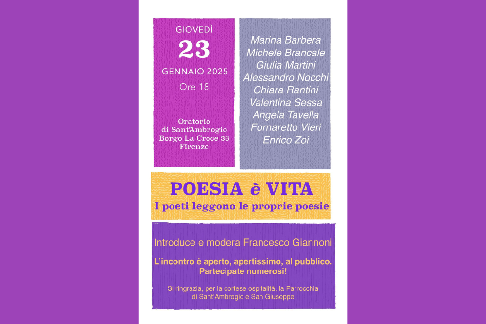 Giovedì 23 gennaio 2025, alle ore 18, presso l’Oratorio di Sant’Ambrogio, in Borgo la Croce 36, a Firenze, avrà luogo l'incontro "Poesia è vita. I poeti leggono le proprie poesie".