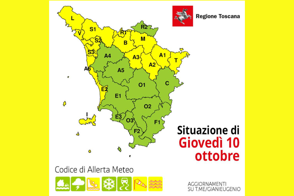 Nuova allerta meteo, di codice giallo, in Toscana per rischio idrogeologico e idraulico del reticolo minore, vento forte e mareggiate è stata emessa dalla Sala operativa unificata della Protezione civile regionale. Ha valore, si spiega, per tutta la giornata di domani, giovedì 10 ottobre, interessate soprattutto le valli dell'Arno, del Bisenzio, dell'Ombrone pistoiese, del Remo e del Serchio, la Valtiberina, la Garfagnana, la Lunigiana, il Mugello e la Valdisieve, la Versilia, la costa pisana e livornese, le isole. Una nuova perturbazione, si spiega, transiterà sulla Toscana.
