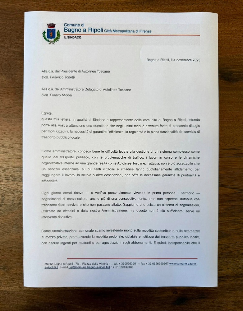 questa mia lettera, in qualità di Sindaco e rappresentante della comunità di Bagno a Ripoli, intende porre alla Vostra attenzione una questione che negli ultimi mesi è divenuta fonte di crescente disagio per molti cittadini: la necessità di garantire l'efficienza, la regolarità e la piena funzionalità del servizio di trasporto pubblico locale.