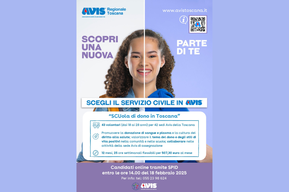 “Candidarsi per svolgere servizio civile in una delle sedi di Avis Toscana - commenta la presidente regionale, Claudia Firenze - significa aprirsi ad un’intensa esperienza lavorativa e umana. Il ricambio generazionale è uno dei nostri obiettivi prioritari: i giovani che arrivano come volontari, tramite questo canale, rappresentano per noi il futuro dell’associazione. Vogliamo che il loro sia un percorso arricchente, in termini di nuove competenze e sensibilità”.